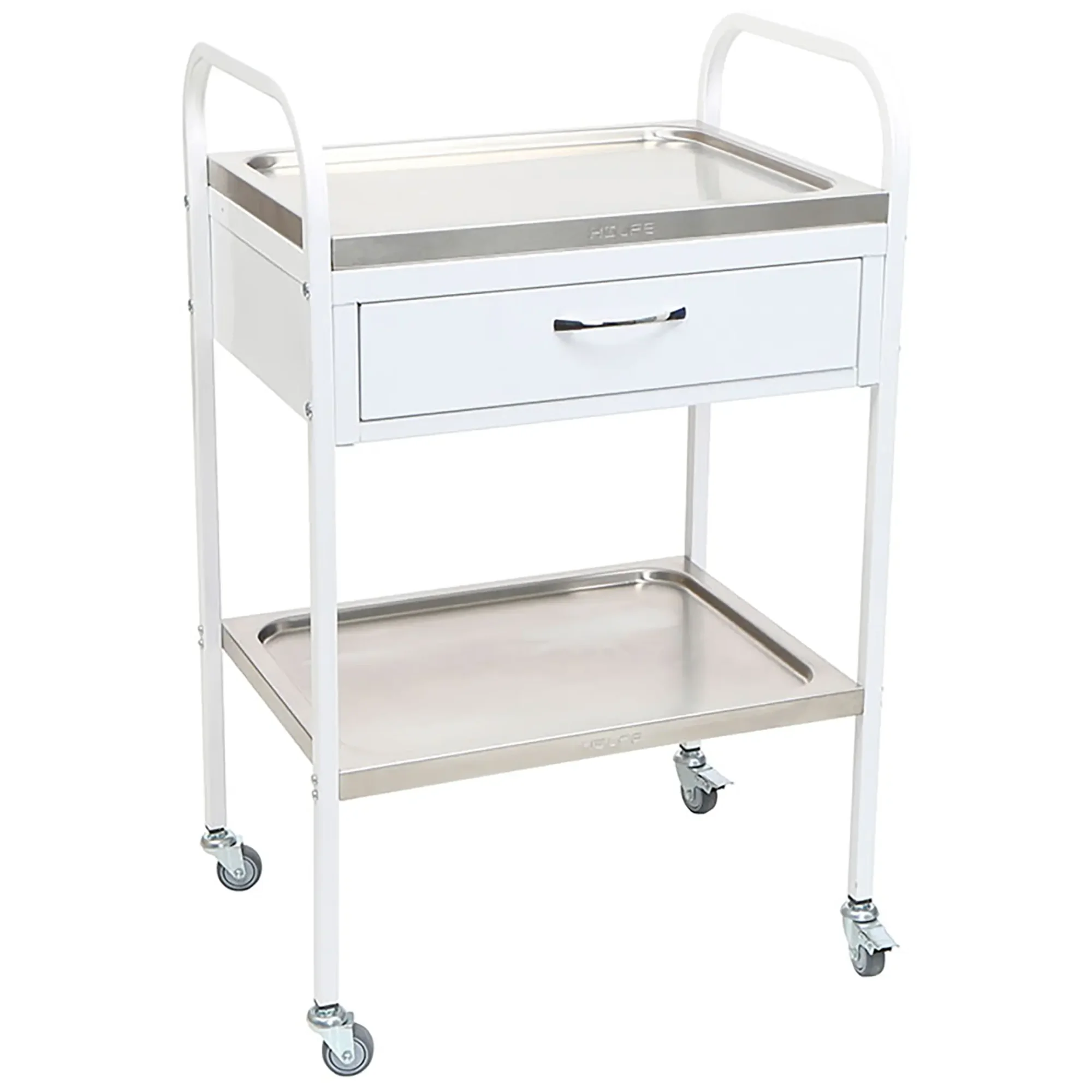 • столик процедурный имеет 4 колеса из немаркой резины, D= 50 мм. Два колеса снабжены тормозом;