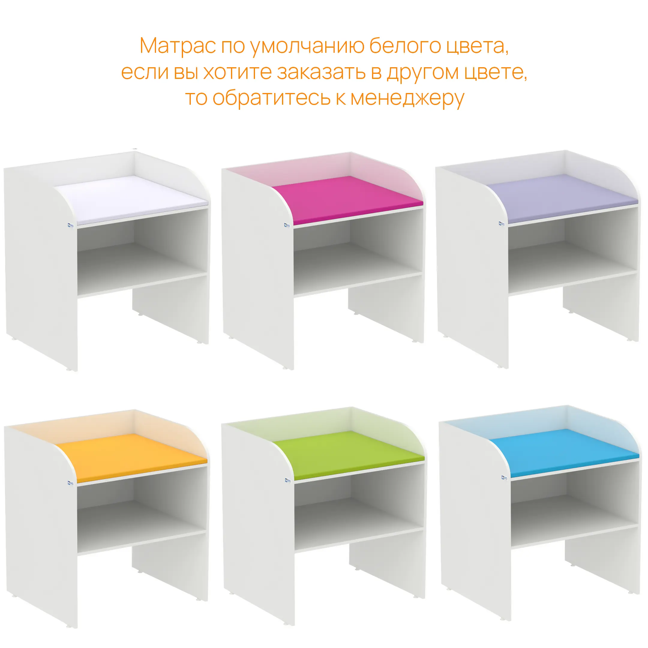 - Гигиеничный матрас в комплекте — входит в стандартную поставку, цвет матраса по умолчанию — белый. По запросу доступны другие цвета (синий, сиреневый, лайм, оранжевый, розовый).