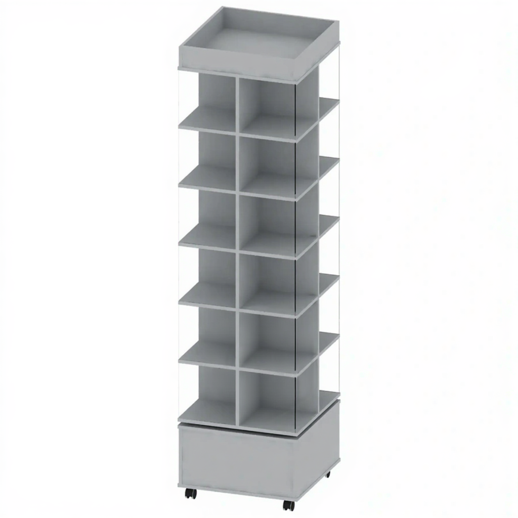 - Функциональность и экономия пространства — вращающаяся конструкция позволяет разместить большой объем материалов в одной точке, не загромождая помещение и оставаясь доступным со всех сторон.