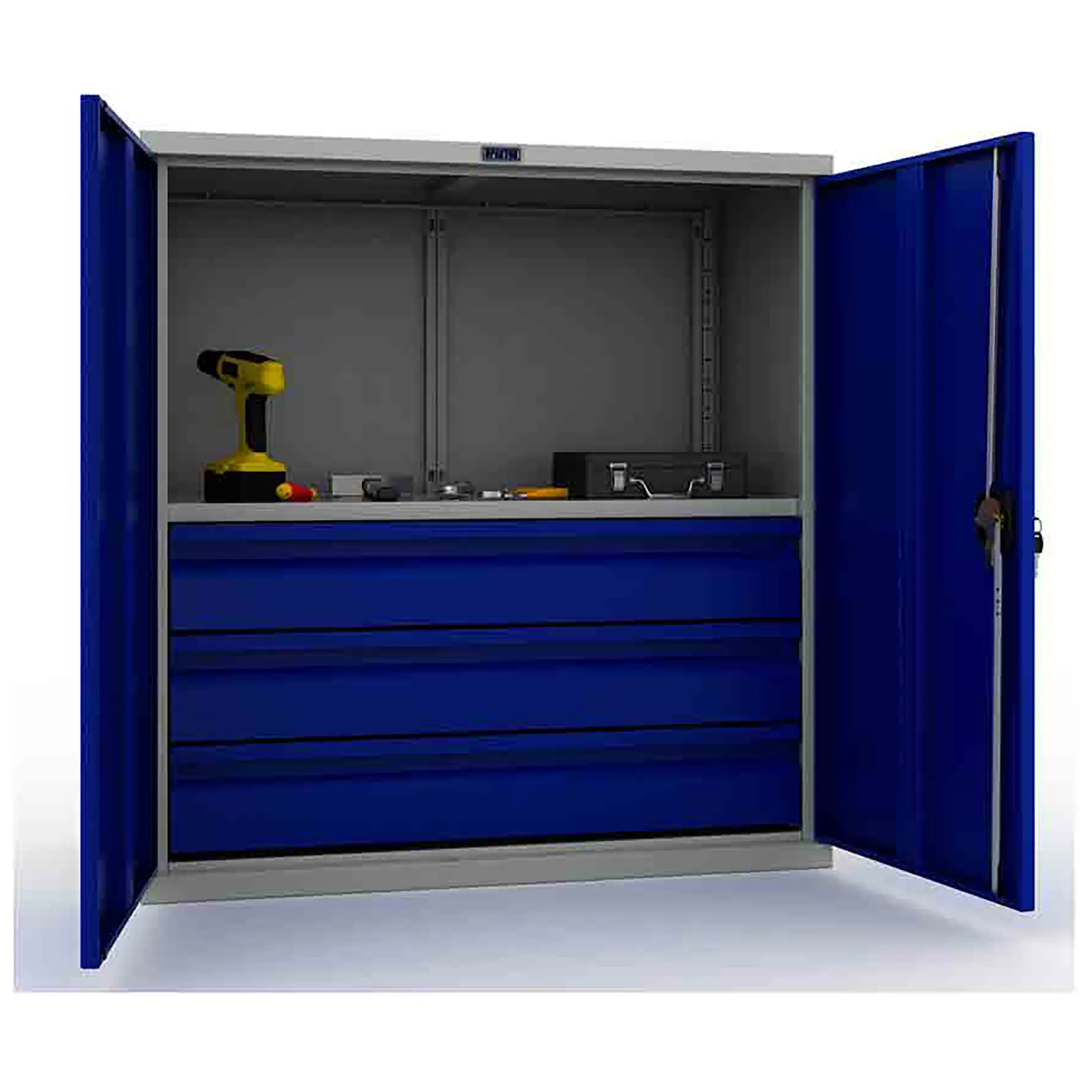 - Высочайший уровень защиты и безопасности — цельнометаллический корпус с запирающимися на общий замок дверями обеспечивает надежную защиту от краж и несанкционированного доступа. Конструкция также оберегает содержимое от производственных загрязнений: пыли, стружки, масла, брызг и влаги, что критически важно для поддержания инструмента в исправном и точном состоянии.