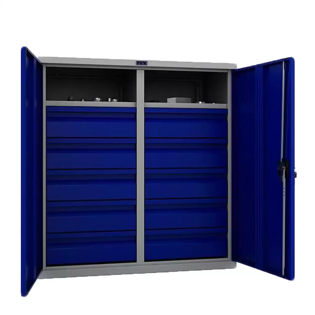- Надежная защита содержимого — прочный стальной корпус и запирающиеся на замок двери обеспечивают защиту ценного инструмента от кражи, несанкционированного использования, а также от пыли и влаги в нерабочее время. Замок гарантирует базовый уровень безопасности.