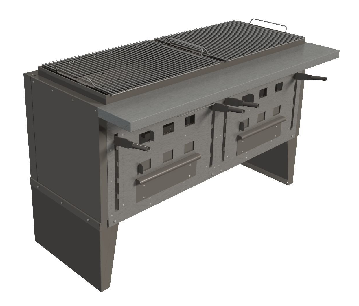 Гриль-мангал угольный Vesta VEGA 2 предназначена для приготовления блюд на углях на предприятиях общественного питания. Корпус выполнен из стали толщиной 5 мм, наружная обшивка и технологический стол - из нержавеющей стали, узел подъема колосниковой решетки имеет дополнительные сменные стенки из стали толщиной 5 мм, колосниковая решетка - из специальной жаростойкой стали 17Г1С (котельная сталь) толщиной 6 мм, решетка для жарки - из прутков нержавеющей стали диаметром 6 мм.