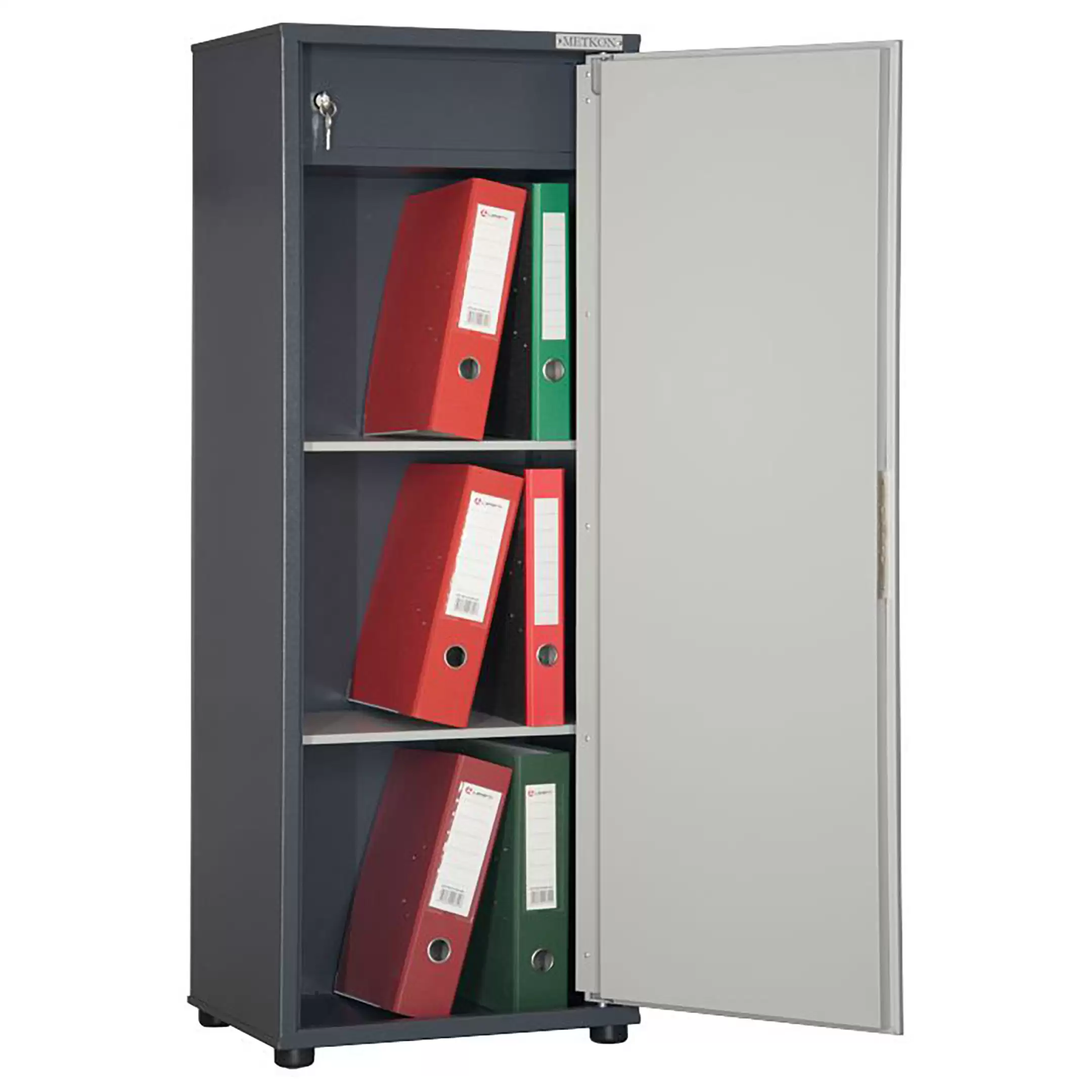 - Гибкая организация внутреннего пространства — модель оборудована регулируемыми по высоте металлическими полками, что позволяет адаптировать внутреннюю планировку под различные типы хранения: от стандартных архивных папок формата А4 до канцелярских принадлежностей, книг и личных вещей сотрудников.