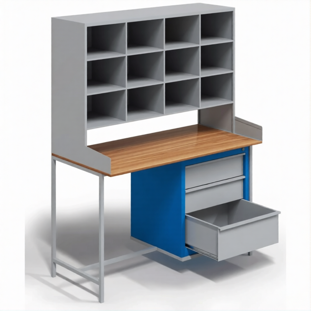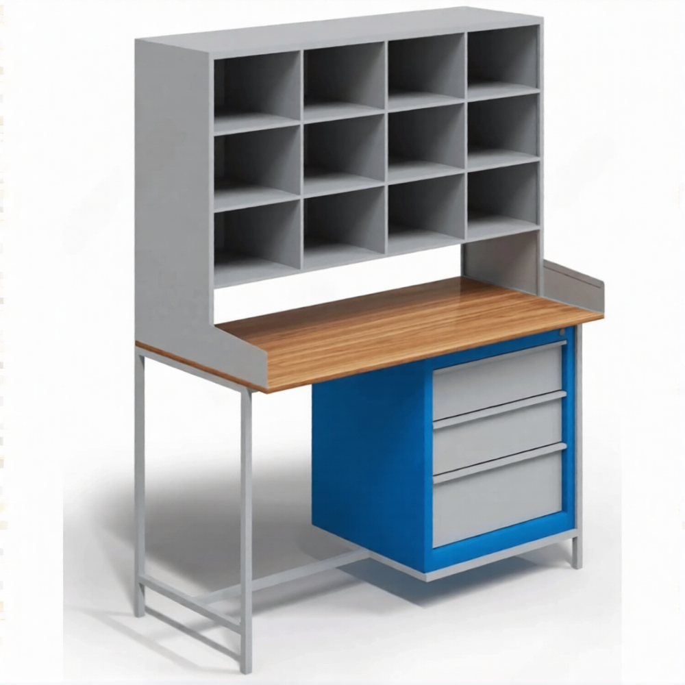 • Данная модель имеет 12 открытых ячеек для сбора и хранения писем, тумбу с 3 выдвижными ящиками и стол для работы с почтовыми документами.
