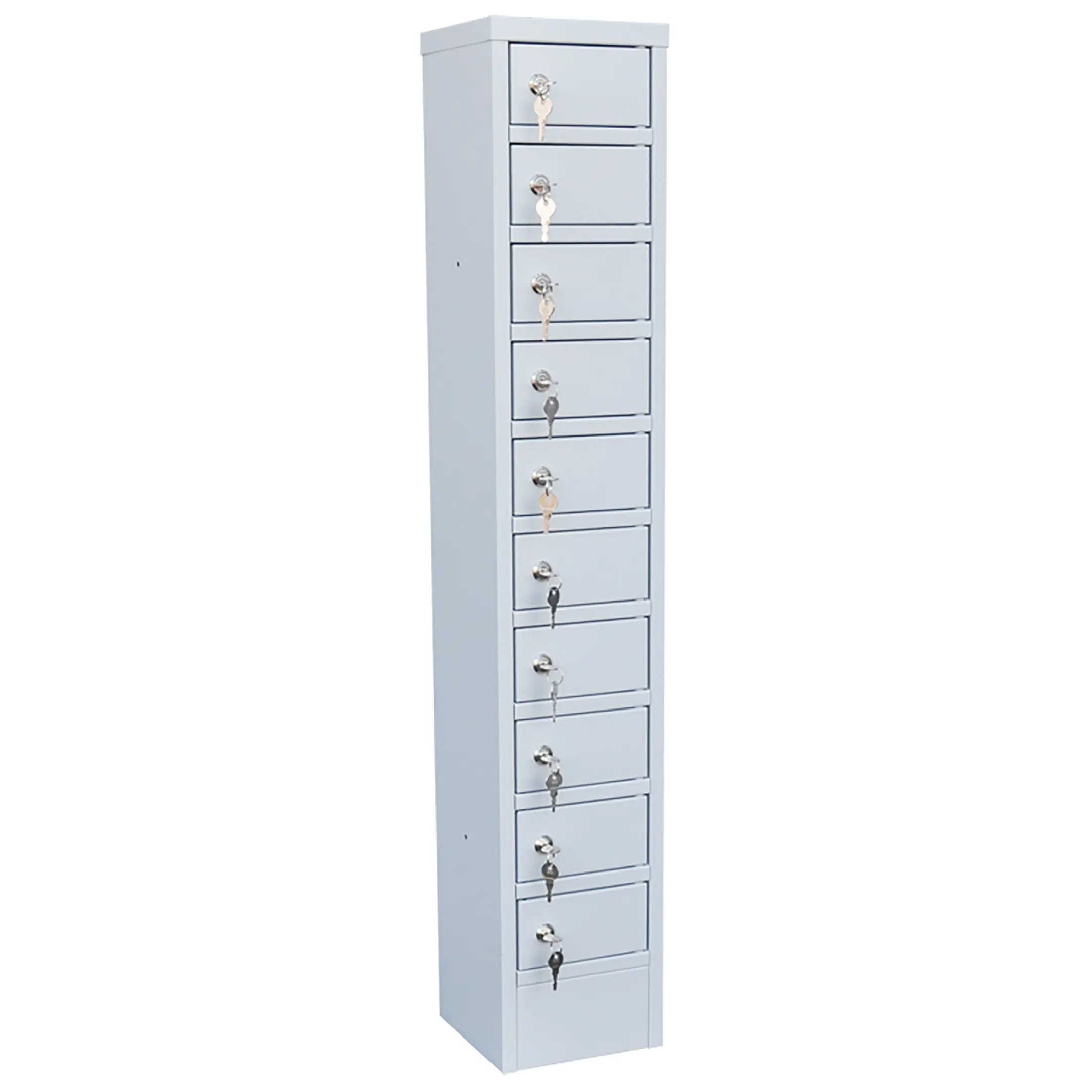 - Максимальная компактность и экономия пространства — шкаф предоставляет 10 индивидуальных запирающихся ячеек, занимая при этом минимальную площадь. Его можно легко разместить на краю рабочего стола, прилавке, полке или в нише, что делает его идеальным для мест, где каждый сантиметр на счету.
