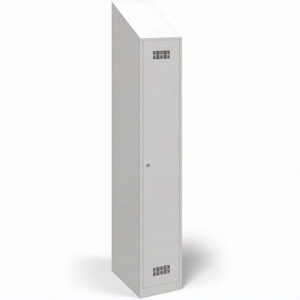 • Металлические односекционные шкафы для одежды с наклонной крышей предназначены для установки в условиях ограниченного пространства. Угол наклона крыши - 45°.