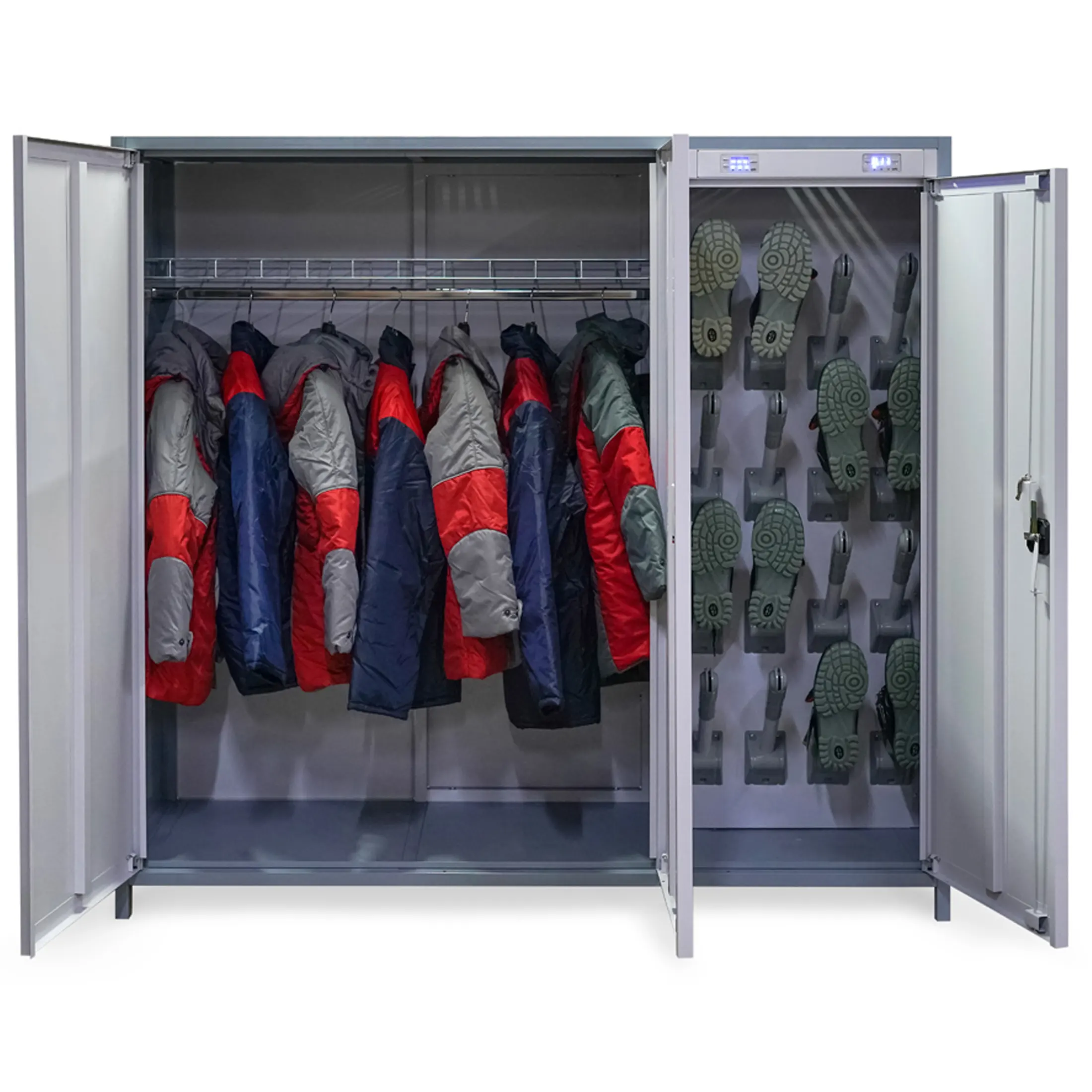 - Высокая производительность и вместимость — шкаф рассчитан на загрузку значительных объемов одежды и обуви за один цикл, что позволяет эффективно обслуживать большие коллективы на предприятиях, в спортивных комплексах или медицинских стационарах.