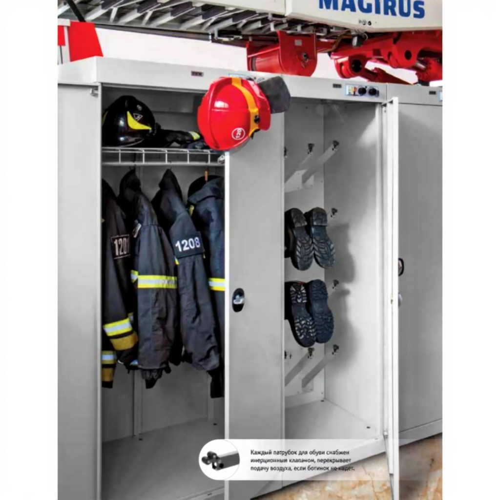 - Универсальность применения — шкаф подходит для сушки различных типов изделий: рабочей и спортивной одежды, спецодежды, обуви, полотенец и инвентаря, что делает его многофункциональным решением для разных сфер деятельности.